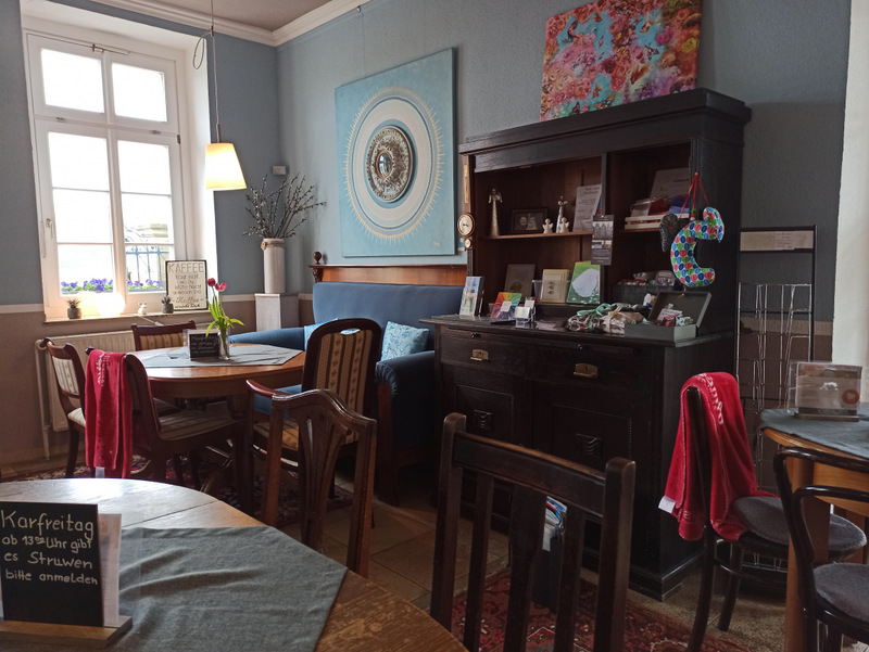 Op de middag dat we het Sandstein Museum in Havixbeck bezoeken, is het regenachtig. We vinden het een goed plan om na dat bezoek naar het vlakbij gelegen Café Klute te gaan. Zodra we hier over de drempel stappen, voelen we ons thuis. Bij de ingang staat de taartenvitrine, maar deze keer slaan we een stuk taart over. We zoeken een plek en bestellen voor elk een pot thee. Hier kunnen we dus gezellig een tijdje vertoeven. Er is ook veel te zien, o.a. de schilderijen van Corinna Schnabel. Haar atelier bevindt zich naast Café Klute.